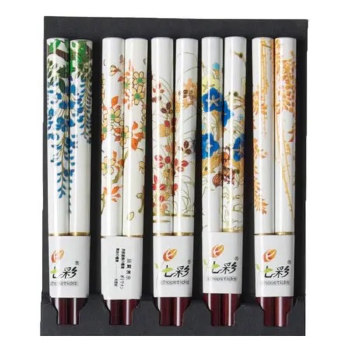 5 pairs of chopsticks packaged in a cellophane bag with header. Handwash recommended. Made in China.