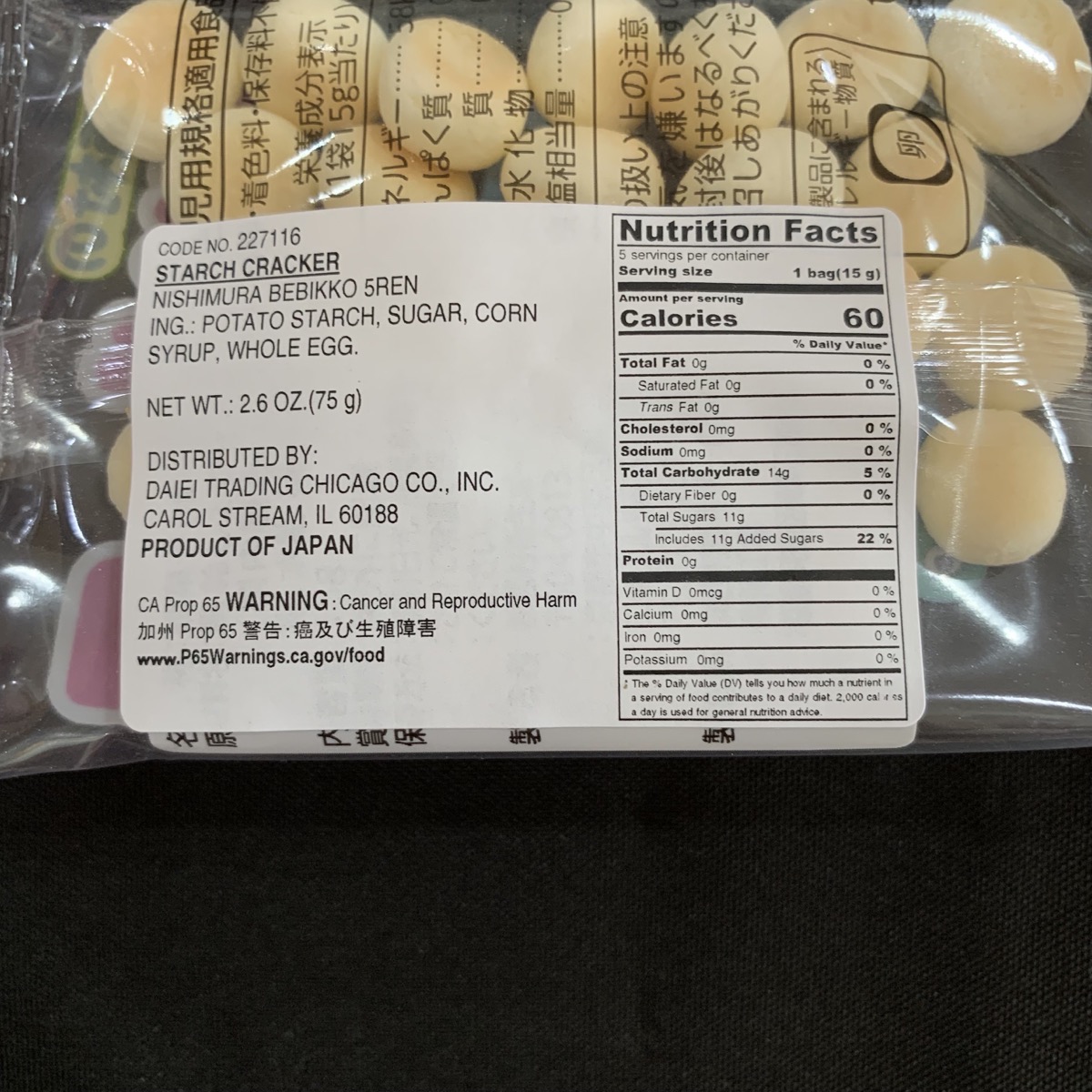 5 packets of potato starch crackers. 2.6 ounces total
