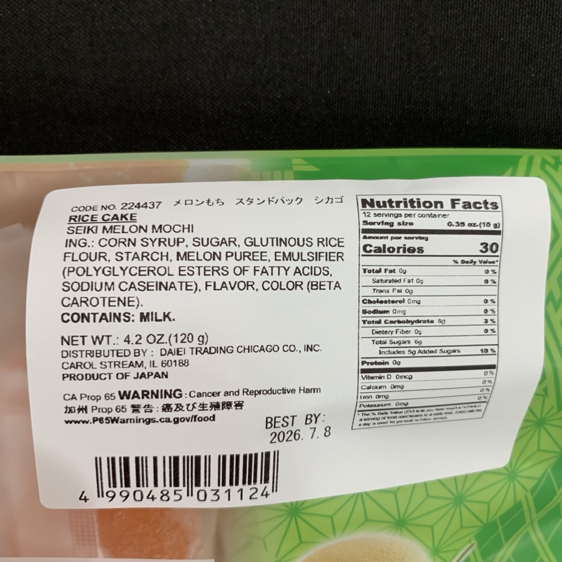 Melon favored mochi individually wrapped. 4.5 ounce package