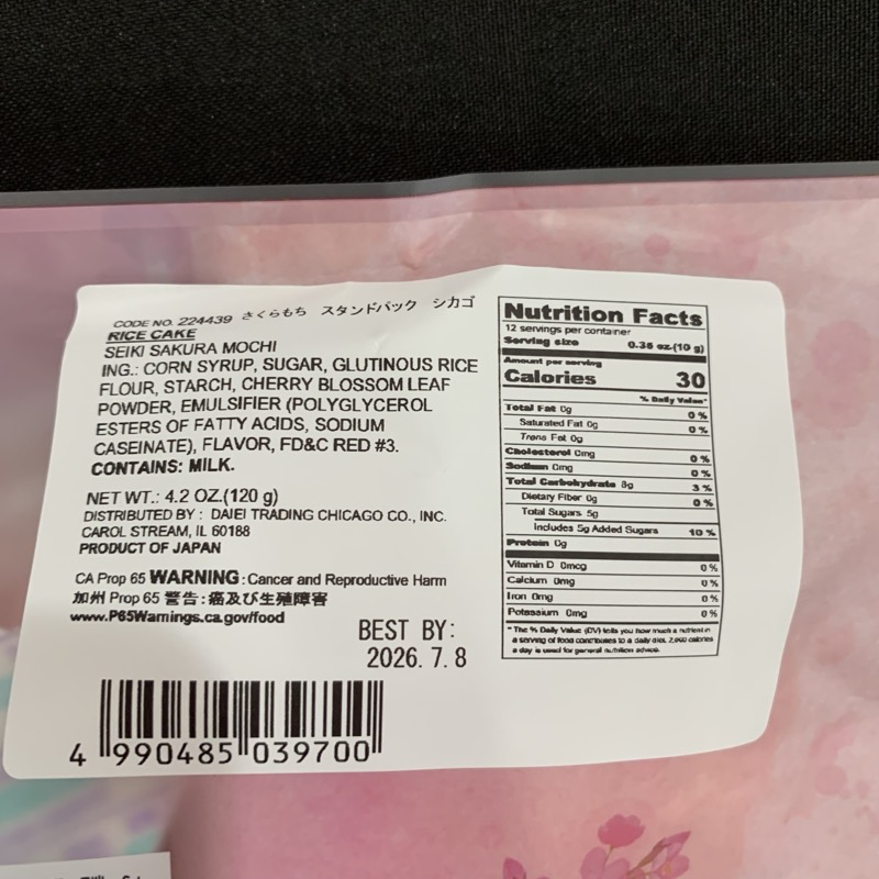 Sakura (cherry blossom) flavored mochi, individually wrapped pieces. 4.5 ounce package.