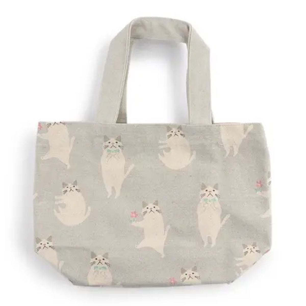 Light gray tote bag with white cat design. Design on both sides.
